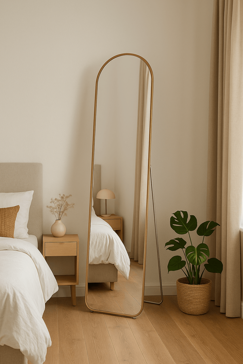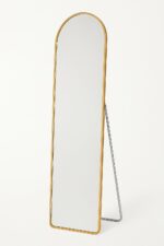 Le cadre doré raffiné lui donne un aspect chic et contemporain, tandis que le pied argenté robuste assure stabilité et durabilité. Sa hauteur généreuse (1m30) permet une utilisation confortable en miroir de plein pied.