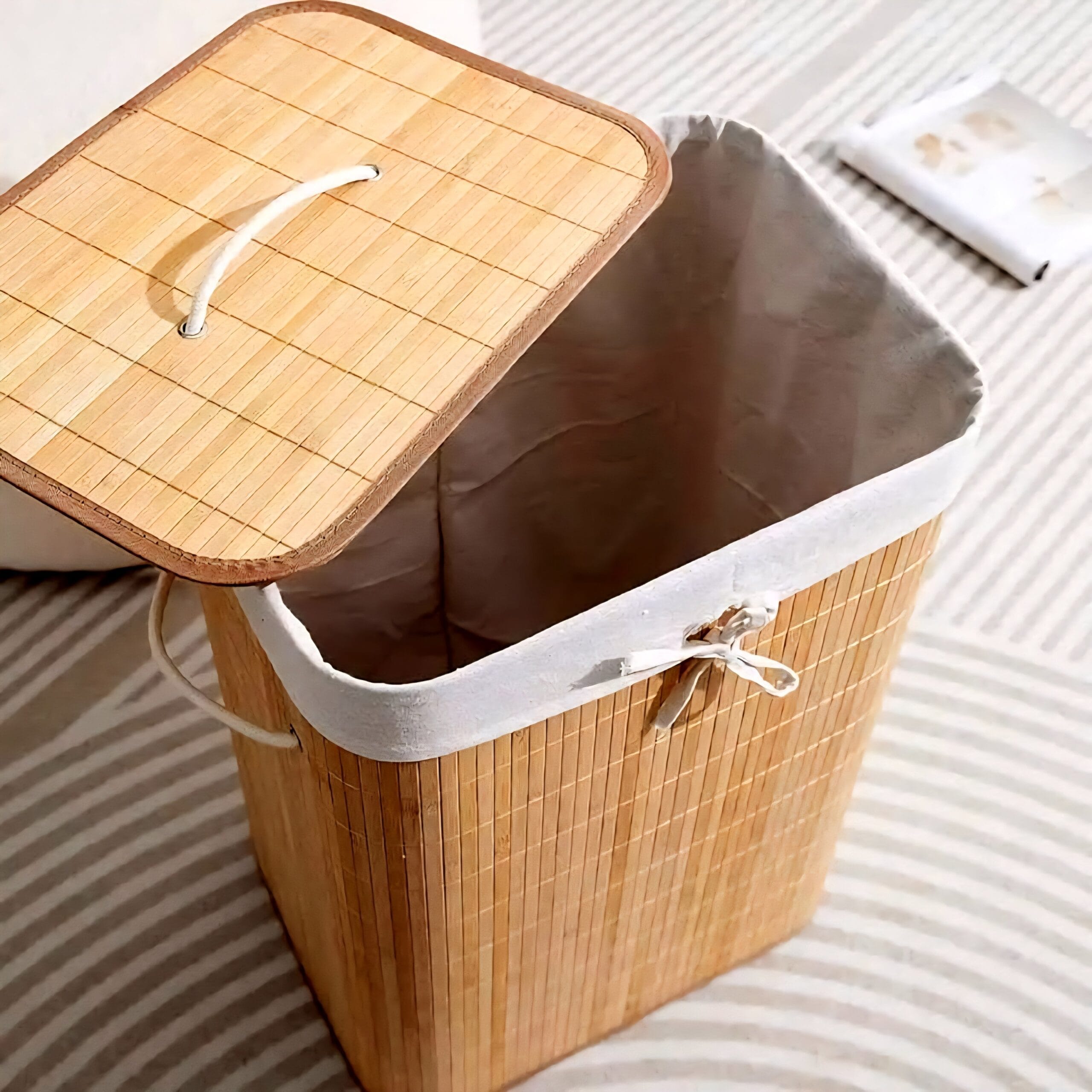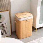 Ce panier à linge rectangulaire en bambou (65 x 35 x H70 cm) est conçu pour combiner esthétique et praticité. Sa grande hauteur et sa longueur de 65 cm offrent un volume généreux pour ranger votre linge tout en s’intégrant facilement dans un coin ou le long d’un mur.